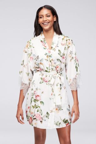 Trimmed in eyelash lace, this chiffon kimono robe blooms with a photographic botanical print, making it a romantic choice for the honeymoon and beyond.