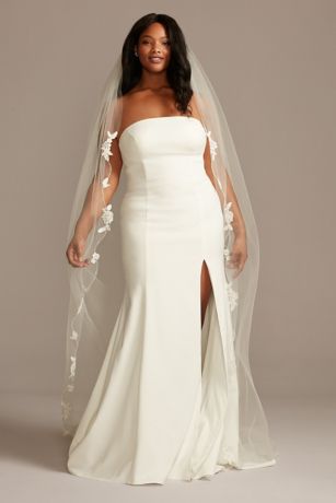 Embroidered floral appliques and delicate beading trailalong the edge of this cathedral-length veil, forming a sweet scalloped pattern.