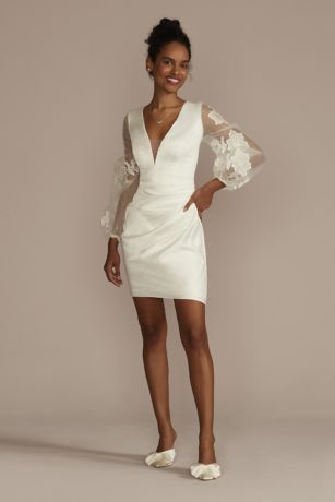 Both sexy and demure, this stunning satin short dress features a plunging neckline and a draped skirt. Long lace-appliqued billow sleeves add a dainty layer of coverage to your overall look.