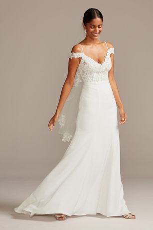 Rich floral appliques embellish the sheer bodice of this lace and stretch-crepe wedding dress, with budding flowers and leaves covering the illusion lace, V-neck bodice and draping off the shoulder swag sleeves. Boning details, crisp seams down the length of the slightly flared mermaid skirt, and dainty spaghetti straps has a lengthening effect that suits any and every bride.