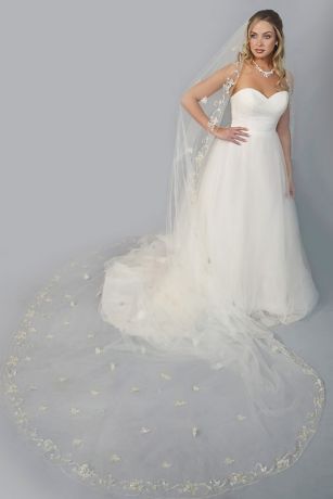 Beautiful rhinestone-embellished embroidered flowers bloom on this extra-long royal cathedral-length veil.