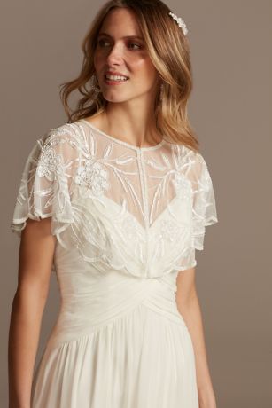 Floral Beaded Mesh Capelet with Scalloped Edge
