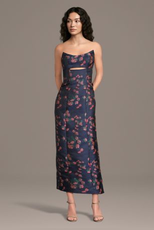 This ankle-length sheath features a strapless neckline floral brocade design with a subtle bodice cutout for a modern touch. Optional spaghetti straps let you customize the look, blending romantic texture with sleek versatility.
