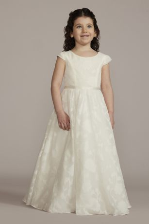A ball gown silhouette is perfect for any princess wannabe! Add some fun with a burnout floral pattern and a faux racerback. Cap sleeves keep your flower girl comfortable all night long.