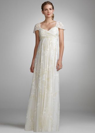 This floral burnout design adds texture and vivacity to this delicate, soft chiffon gown. Empire waist is flattering on many body types. The shirred bodice features a surplice neckline & flutter sleeves for added coverage. Available in Deep Ivory floral burnout print. Floor length skirt. Fully lined. Invisible back zip. Imported polyester. Dry clean only.