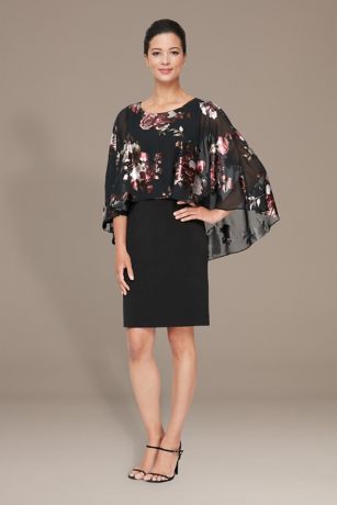 A high-low floral print chiffon capelet drapes over this knee-length sheath dress, creating an LBD that's anything but ordinary.