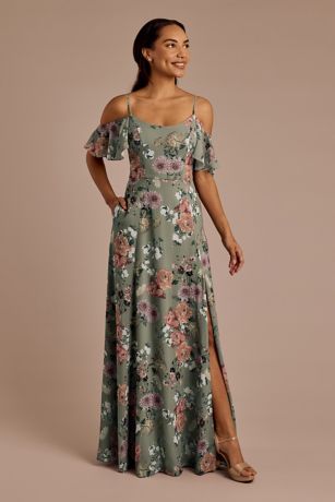 This beautiful floral print chiffon dress combines boho cold-shoulder sleeves with adjustable spaghetti straps and all-important pockets.
