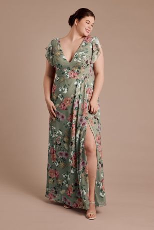 This floral print chiffon dress is full of romantic details, from flutter sleeves and a V-neck bodice to an A-line skirt with slit.