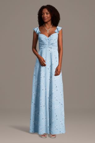 Lightweight floral print chiffon flows beautifully on this A-line dress, designed with soft ruffle sleeves, a ruched bodice, and convenient side pockets. A graceful style with modern ease that's perfect for bridesmaids and partygoers.