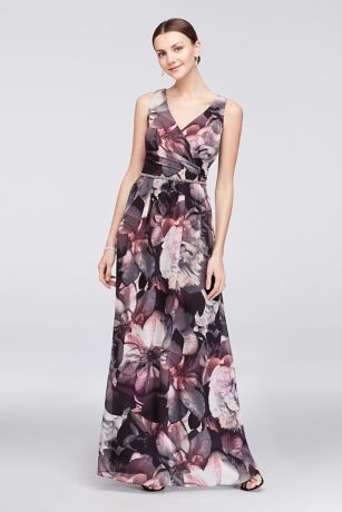 The drapey, surplice neckline of this flowing, floral chiffon gown forms a flattering deep-V, as the jeweled waistband adds sparkle.