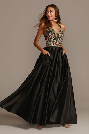 This luxe satin halter gown is embroidered at the bodice with ornate florals that are finished with gold detailing and texturized with corded lace. The elegant embellishment is paired with an illusion plunge, an open back, and a full ball gown skirt with pockets.