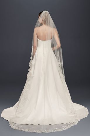This cathedral length veil evokes a sunflower meadow, with round blossoms, centered by rhinestone gems, embroidered along its scalloped edge.