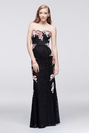Lovely embroidered floral details bloom on the lace overlay of this curve-hugging column dress.