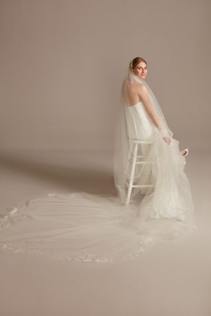 Embroidered floral blooms, accented with brilliantly shining crystals, cascade down the hem of this beautiful tulle royal cathedral veil.