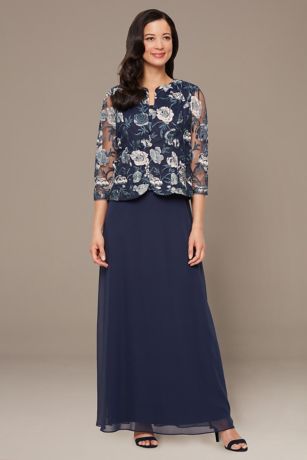 Graceful and refined, this long jacket dress features an embroidered tulle bodice with a flattering scoop neckline and a flowing chiffon skirt. The removable matching jacket adds versatility, making it a perfect choice for mothers of the bride or groom.