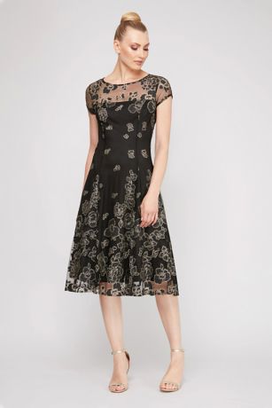 Clusters of glittery flowers adorn this A-line dress from illusion neckline to tea-length hem. Sheer short sleeves complete the look.
