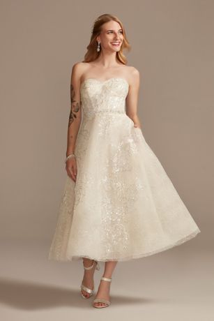 Brimming with both shine and style, this strapless dress is crafted of glittery floral tulle and topped with lace appliques and over 2,000 hand-sewn beads and sequins. The interior boning at the bodice adds lovely shape, while the stunning tea-length skirt creates a sensational focal point. (Plus, it has pockets!)