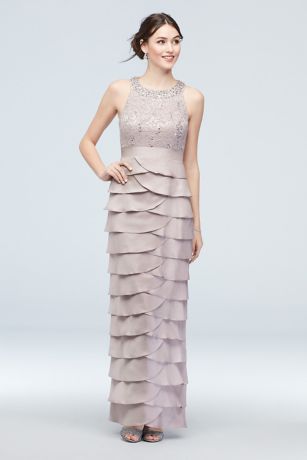 Turn heads in this high-neck sheath with a tiered ruffle skirt. Eye-catching accents like sparkling embellishments, sequin lace, metallic sparkles, and shimmering threading add extra pizzazz.