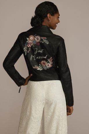 This embroidered \"Just Married\" vegan leather jacket is the perfect piece for the fashionista bride who loves a rock-and-roll look. The moody floral embroidery features our exclusive bridesmaid colors including wine, dusty sage, dusty blue, blush, and coral reef, to match a wide array of big-day palettes. A moto silhouette and accent zippers add an extra touch of cool.