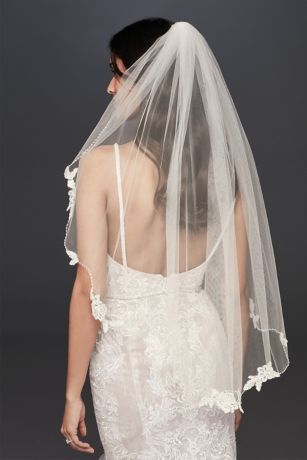 This stunning veil from David's Bridal features delicate floral lace and sparkling crystal trim, adding a touch of elegance to any bridal look. The elbow length design is perfect for brides who want a classic and timeless veil that won't overpower their gown. Whether you're walking down the aisle in a ballgown or a sleek sheath dress, this veil will complement your style beautifully. The soft tulle fabric drapes gracefully over your shoulders, creating a romantic and ethereal effect. With its intricate lace detailing and shimmering crystals, this bridal accessory veil is sure to make you feel like a true princess on your special day.