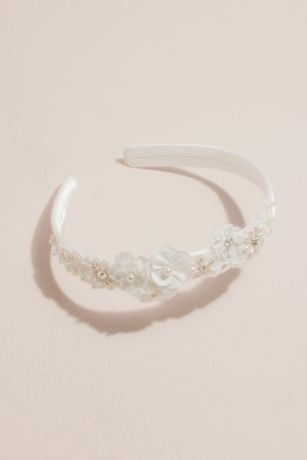 Ribbon roses and soft floral lace are centered with pretty pearls on this sweet flower girl headband.