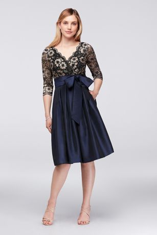 A regal look for the mother of the bride or groom, this 3/4-sleeve fit-and-flare dress shimmers with a gilded floral lace bodice and a lustrous shantung skirt.