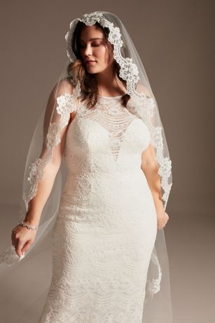Trimmed in beautiful floral lace, this cathedral veil skims the floor in dramatic fashion. Wear it as a classic mantilla veil or secure it lower in the hair for a more contemporary look.