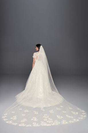Gauzy tulle and floral lace appliques come together to create this exquisite cathedral-length veil.
