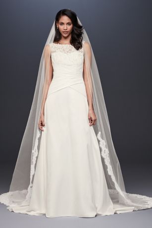 With floral eyelash lace embellished by more than 2,000 Swarovski crystals and a hand-sewn border of twinkling bugle beads, this tulle cathedral veil is a beautiful sight to behold.