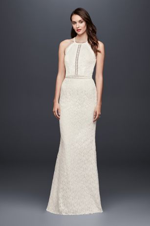 Crafted of distinctive floral lace and inset with bands of crochet at the bodice and waist, this slim halter wedding dress has another unique surprise: turn around to reveal a sleek lace racerback detail.
