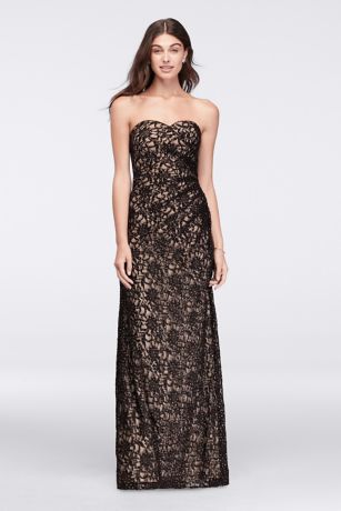 Dotted with glitter, this long lace gown has bling built in, but the simple column silhouette could stand up to the addition of a chunky, gem-studded necklace.