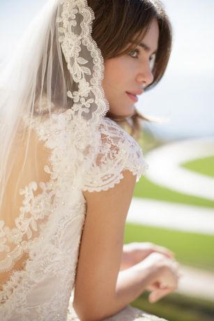 Hand-sewn floral alencon lace trims the edges of this single-layer tulle veil. Choose from elbow or fingertip length.