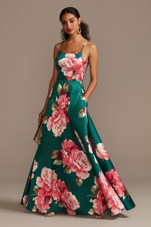 A floral print always stands out from the crowd, and this bold blooming mikado ball gown is no exception. A lace racerback and spaghetti straps add delicate detail.