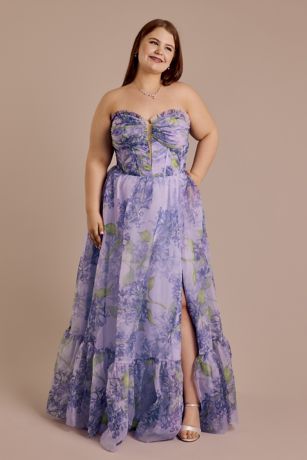 Isn't it romantic? This floral print organza ball gown for prom is breezy and beautiful, with a pleated sweetheart neckline and a flounce hem.