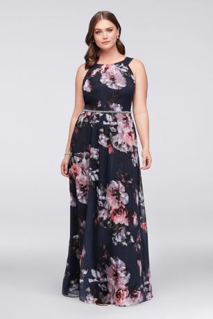 This floral chiffon plus-size halter dress makes a beautiful first impression, and is full of second-glance details, like fine metallic threads, a beaded belt, and front pockets perfect for holding big-event essentials.