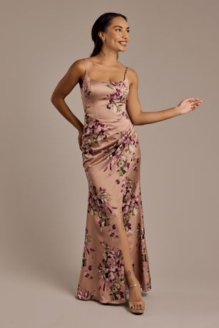 This floral print sheath dress combines elegance and edge. The corset-style bodice with a basque waist flatters your figure, while the silky satiny charmeuse flows into a sleek skirt. A side slit adds a touch of boldness, perfect for bridesmaids and special events.