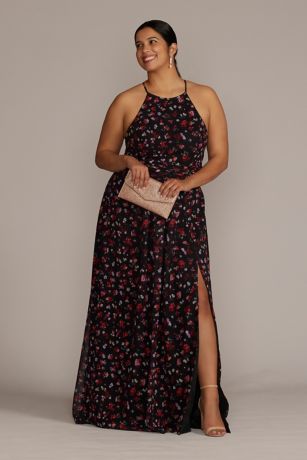 What's a spring or summer event without a floral print dress? Make your mark on the occasion with this charming A-line designed with a halter neckline, waist detail, and flowy, slit-accented skirt.