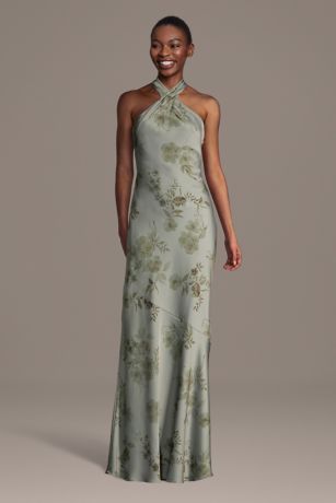 A high Y-neckline adds contemporary flair to this luxurious floral print matte satin sheath dress, which hugs the figure in all the right places with bias-cut fabric. Perfect for bridesmaids and partygoers alike.