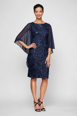 Sequin flowers shine atop this short shift dress, while chiffon capelet sleeves add graceful detail.