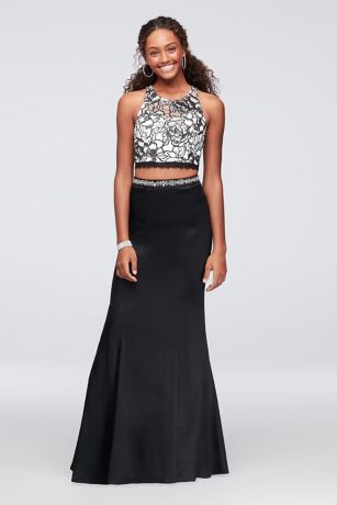 Take a spin in this two-piece dress to show off the satin mermaid skirt's cascading back ruffle. All eyes will stay on you once the crowd spots the shimmering, sequin-appliqued floral bodice.