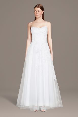 This A-line wedding dress features delicate spaghetti straps, a low back, and a sweep train for effortless elegance. Crafted from floral tulle, this wedding dress is breezy and oh-so romantic. The Edit by DB Studio is a modern, style-forward collection offering elevated looks for weddings and every RSVP.