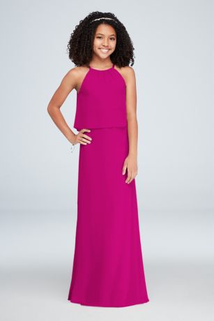 This crinkle chiffon halter sheath junior bridesmaid dress is graced with a high neck, a grosgrain ribbon tie, and a flounce at the bodice.