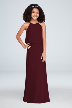 This crinkle chiffon halter sheath junior bridesmaid dress is graced with a high neck, a grosgrain ribbon tie, and a flounce at the bodice.