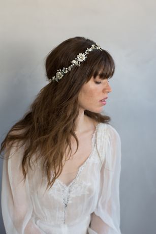 This handmade flower crown features enamel-painted blossoms with Swarovski crystal centers. Wear it in your hair, or style it as a belt or necklace.