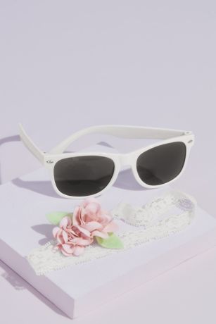 Outfit your flower girl in this super cute duo: a sweet stretch lace headband embellished with blooming flower buds and a pair of wayfarer-style sunglasses, detailed with \"Petal Princess\" on the arm.