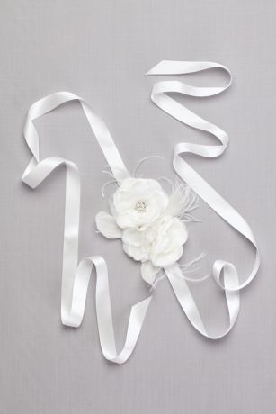 A trio of handmade fabric flowers, with crystal stamens and airy feather accents, adorns this satin ribbon sash.