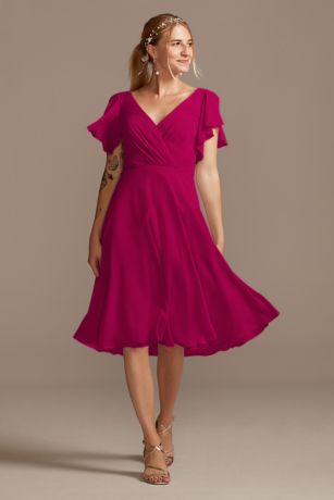 This below-the-knee bridesmaid dress gives an aura of dreamy romance from the softly pleated, plunging-V neckline to the soft, floaty skirt. The faux-wrap style bodice is finished with flutter sleeves.