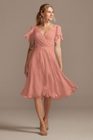 This below-the-knee bridesmaid dress gives an aura of dreamy romance from the softly pleated, plunging-V neckline to the soft, floaty skirt. The faux-wrap style bodice is finished with flutter sleeves.