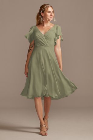 This below-the-knee bridesmaid dress gives an aura of dreamy romance from the softly pleated, plunging-V neckline to the soft, floaty skirt. The faux-wrap style bodice is finished with flutter sleeves.
