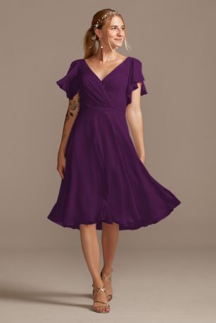 This below-the-knee bridesmaid dress gives an aura of dreamy romance from the softly pleated, plunging-V neckline to the soft, floaty skirt. The faux-wrap style bodice is finished with flutter sleeves.